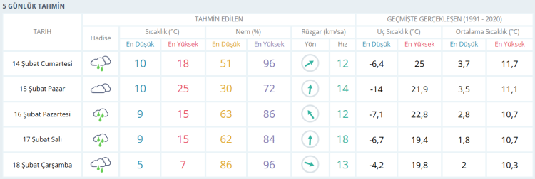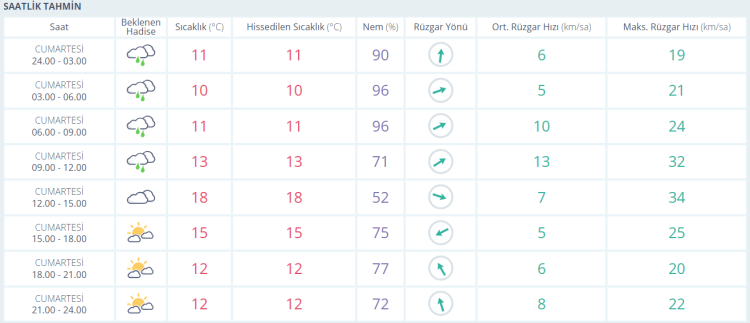 Cumartesi günü öğle saatlerine doğru yağışın zayıflamasıyla birlikte sıcaklık 18 dereceye kadar yükseliyor. Öğleden sonra bulutlar arasından güneş yüzünü gösterse de akşam saatlerinde hava yeniden serinliyor ve termometreler 12–15 derece aralığına geriliyor. Gün boyunca nem oranı yüksek seyredecek, rüzgâr ise hafif ve zaman zaman orta kuvvette esecek.