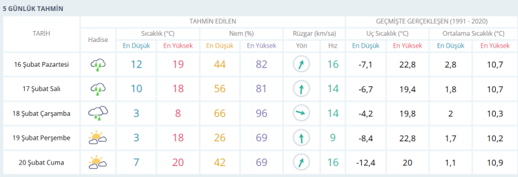 Beş günlük tahmine göre kentte hafta ortasına kadar yağışlı hava etkisini sürdürecek. Salı günü en düşük sıcaklığın 10, en yüksek sıcaklığın 18 derece olması beklenirken, çarşamba günü sıcaklık belirgin şekilde düşerek 3 ila 8 derece aralığına inecek ve nem oranı yüzde 90’ların üzerine çıkacak. Perşembe günü yağış yerini parçalı bulutlu bir gökyüzüne bırakacak; sabah saatlerinde 3 dereceye kadar düşen sıcaklık gün içinde 18 dereceye kadar yükselecek. Cuma günü ise bahar havası etkisini artıracak, en yüksek sıcaklığın 20 dereceye ulaşması öngörülüyor.