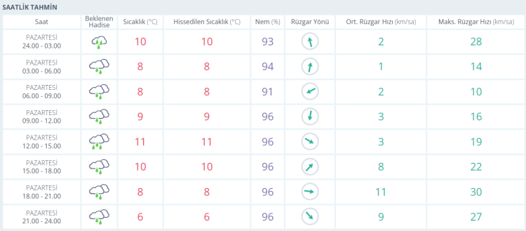 Bursa’da yeni haftaya yağışlı ve serin bir hava hâkim. Pazartesi günü gece yarısından itibaren aralıklarla etkisini gösteren yağmur, gün boyunca kenti terk etmiyor. Sıcaklık gece saatlerinde 10 derece civarında seyrederken sabaha karşı 8 dereceye kadar düşüyor. Günün ilerleyen saatlerinde en yüksek sıcaklık 11 dereceye ulaşıyor. Nem oranının gün boyu yüzde 90’ın üzerinde olması nedeniyle hava olduğundan daha soğuk ve bunaltıcı hissediliyor. Rüzgâr genellikle hafif, zaman zaman orta kuvvette eserken akşam saatlerine doğru etkisini biraz artırıyor.