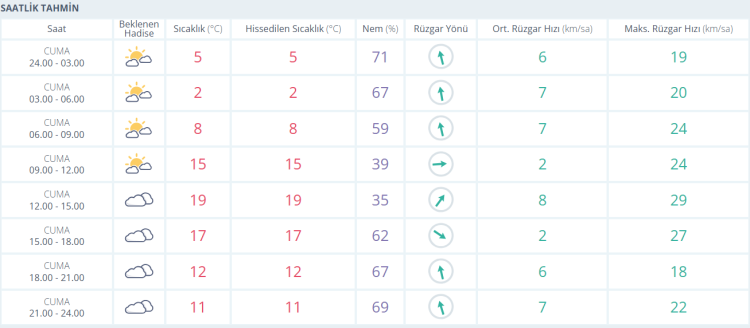 Bursa’da Cuma günü hava parçalı ve çok bulutlu bir gökyüzüyle başlayacak. Gece yarısından sabahın ilk saatlerine kadar sıcaklık 2 ila 5 derece arasında seyredecek. Sabah saatlerinde güneş zaman zaman bulutların arasından kendini gösterse de günün ilerleyen bölümünde bulutlanma artacak. Öğle saatlerinde termometreler 19 dereceye kadar yükselerek günün en sıcak değerini gösterecek. Öğleden sonra ve akşam saatlerinde sıcaklık kademeli olarak düşerek geceye doğru 11 derece civarına inecek. Gün boyunca rüzgar genellikle hafif ve zaman zaman orta kuvvette esecek.