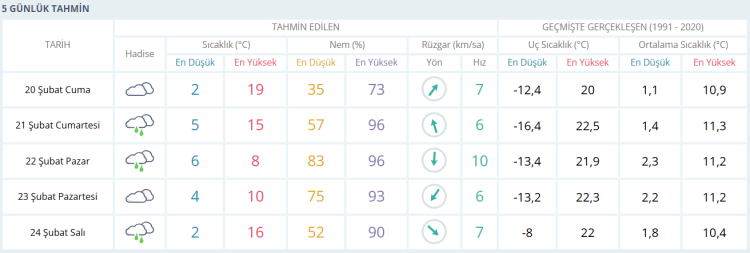 Kentte beş günlük periyotta ise sıcaklık dalgalı bir seyir izleyecek. Cumartesi günü en düşük sıcaklık 5, en yüksek 15 derece olarak tahmin edilirken, yer yer sağanak yağış bekleniyor. Pazar günü yağış etkisini artıracak; hava daha serin olacak ve sıcaklık 6 ila 8 derece arasında kalacak. Yeni haftanın ilk gününde bulutlu bir gökyüzü öne çıkarken sıcaklıklar 4 ila 10 derece aralığında ölçülecek. Salı günü ise yağış yeniden görülecek ve termometreler 2 dereceye kadar düşerken gün içinde 16 dereceye kadar yükselecek.