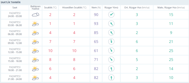 Çarşamba günü ise, 25 Şubat'ta, yağış bekleniyor. Gündüz sıcaklık 10°C civarlarında seyrederken, gece sıcaklık 6°C'ye düşecek. Nem oranı ise yüzde 70 civarında olacak ve rüzgar saatte 9 kilometre hızla esecek. Perşembe günü, 26 Şubat'ta, sıcaklık 7°C'ye kadar düşerken, gece 1°C'ye kadar inmesi bekleniyor. Nem oranı ise yüzde 70 civarında olacak ve rüzgar hızı 9 kilometreye çıkacak. Cuma günü, 27 Şubat'ta ise sıcaklık 7°C civarlarında kalacak. Gece sıcaklık yine -2°C'ye düşecek. Nem oranı yüzde 65 seviyelerinde olacak ve rüzgar saatte 9 kilometre hızla esecek.