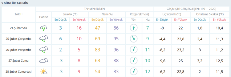 Kentte beş günlük tahminlere bakıldığında ise yağışlı hava dalgasının etkili olacağı görülüyor. Salı günü en düşük 3, en yüksek 16 derece beklenirken, çarşamba günü sıcaklık 6 ila 10 derece arasında değişecek ve yağmur etkisini sürdürecek. Perşembe günü hava daha da serinleyecek; en düşük 2, en yüksek 5 derece tahmin edilirken nem oranının oldukça yüksek seyretmesi bekleniyor. Cuma günü sıcaklık gece saatlerinde sıfırın altına düşerek eksi 3 dereceyi görecek, gün içinde ise 8 dereceye kadar yükselecek. Haftanın son günü cumartesi ise sabah saatlerinde ayaz etkili olacak; en düşük eksi 3 derece ölçülmesi beklenirken gün içinde sıcaklık 9 dereceye kadar çıkacak ve parçalı bulutlu bir hava hakim olacak.