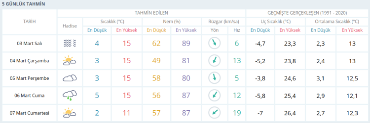 Kentte salı günü parçalı bulutlu bir gökyüzü hâkim. Gece saatlerinde sıcaklık 4–6 derece aralığında ölçülürken, sabah saatlerinden itibaren termometreler hızla yükseliyor. Öğle saatlerinde 15 dereceye kadar çıkan hava sıcaklığı, akşam saatlerinde yeniden 7–9 derece seviyelerine geriliyor. Gün içinde rüzgârın hafif ve zaman zaman orta kuvvette esmesi, özellikle öğle saatlerinde etkisini artırması bekleniyor. Nem oranı ise gün boyunca yüzde 60’ların üzerinde seyrederek akşam saatlerinde yüzde 80’lere yaklaşıyor.