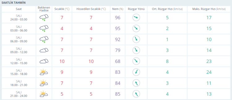 Bursa’da bugün hava çok bulutlu ve yer yer yağışlı geçiyor. Günün ilk saatlerinden itibaren etkili olan yağmurla birlikte sıcaklık sabah saatlerinde 4 dereceye kadar gerilerken, gün içerisinde en yüksek 10 derece civarında seyrediyor. Yüksek nem oranı ve zaman zaman etkisini artıran rüzgâr nedeniyle hava olduğundan daha serin hissediliyor. Akşam ve gece saatlerinde ise sıcaklık yeniden düşüşe geçerek 5 derece seviyelerine iniyor.