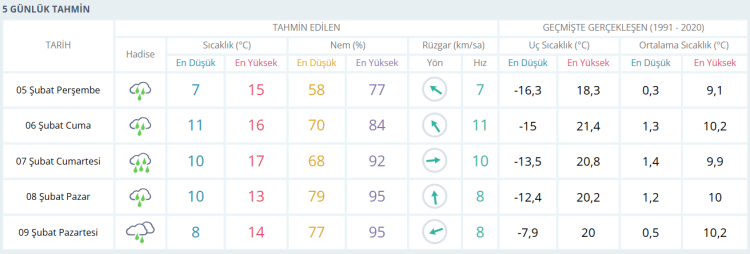 Beş günlük tahmine göre Bursa’da yağışlı hava etkisini sürdürecek. Cuma ve cumartesi günleri aralıklı yağmur beklenirken sıcaklıklar 16–17 derece seviyelerinde olacak. Pazar günü yağış devam ederken sıcaklık bir miktar düşerek 13 dereceye kadar inecek. Pazartesi günü de yağmur geçişleri görülürken en yüksek sıcaklığın 14 derece civarında olması öngörülüyor. Önümüzdeki günlerde nem oranının yüksek, rüzgarın ise zaman zaman kuvvetli esmesi beklenirken, vatandaşların özellikle yağış ve rüzgara karşı tedbirli olması öneriliyor.