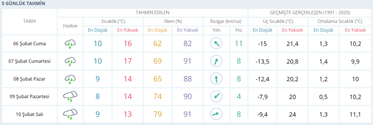 Önümüzdeki beş gün boyunca Bursa’da yağışlı hava etkisini sürdürecek. Cuma ve cumartesi günleri sıcaklıklar 10–17 derece aralığında seyredecek, yağmur zaman zaman etkisini artıracak. Pazar günü sıcaklıklarda hafif bir düşüş görülürken yağış yine kendini hissettirecek. Haftanın başında ise hava biraz daha serinliyor; pazartesi ve salı günleri en yüksek sıcaklıklar 13–14 derece civarında kalıyor. Nem oranının yüksek, rüzgârın ise genellikle hafif ve orta kuvvette olması bekleniyor. Bursa genelinde önümüzdeki günlerde de kapalı ve yağışlı bir hava düzeni öne çıkıyor.