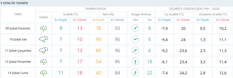 Önümüzdeki beş günlük periyotta Bursa’da yağışlı hava etkisini sürdürmeye devam edecek. Salı günü sıcaklık 7 ile 10 derece arasında değişirken nem oranı oldukça yüksek seyredecek. Çarşamba günü en yüksek sıcaklık yeniden 13 dereceye ulaşsa da yağışlı hava kenti terk etmiyor. Perşembe günü sıcaklıklarda belirgin bir artış bekleniyor; termometreler 17 dereceyi gösterecek ve rüzgar zaman zaman kuvvetlenecek. Haftanın son iş günü olan cuma ise 11 dereceye kadar düşen sabah sıcaklığının ardından gün içinde 18 dereceye kadar ısınan, rüzgarın daha hissedilir olduğu yağışlı bir hava Bursa’yı bekliyor.