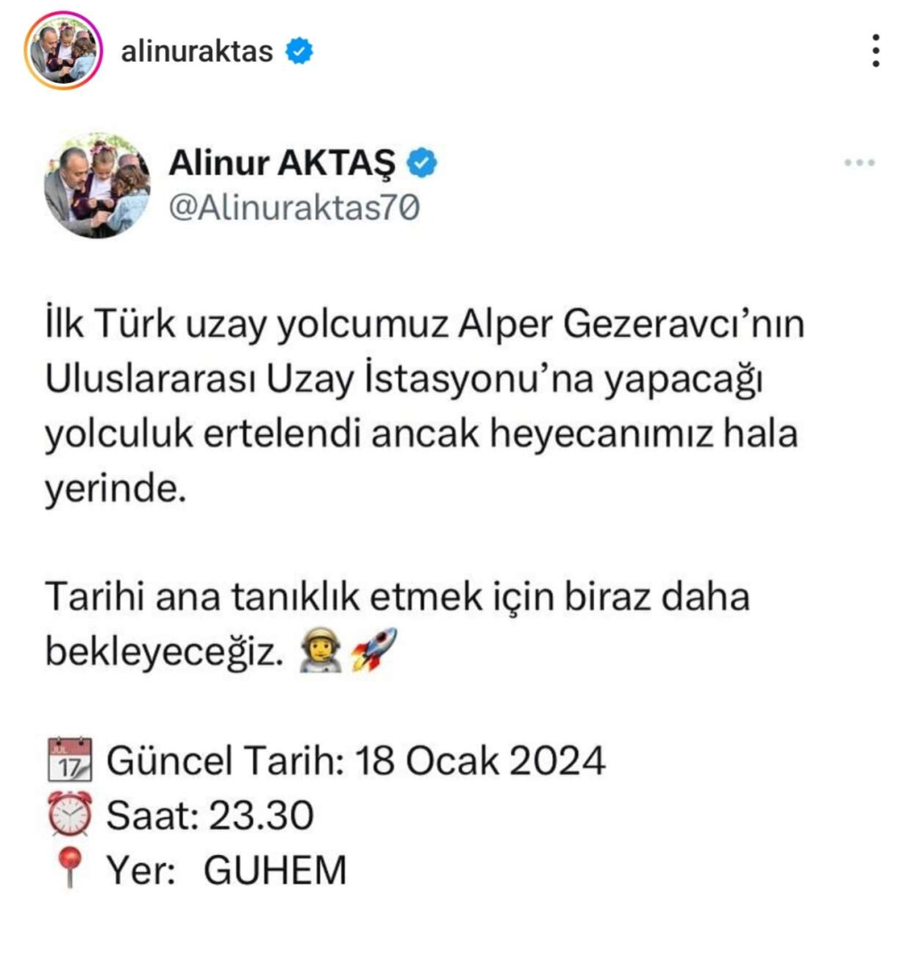 "İlk Türk uzay yolcumuz Alper Gezeravcı'nın Uluslararası Uzay İstasyonuna yapacağı yolculuk ertelendi ancak heyecanımız hala yerinde. Tarihi ana tanıklık etmek için biraz daha bekleyeceğiz."