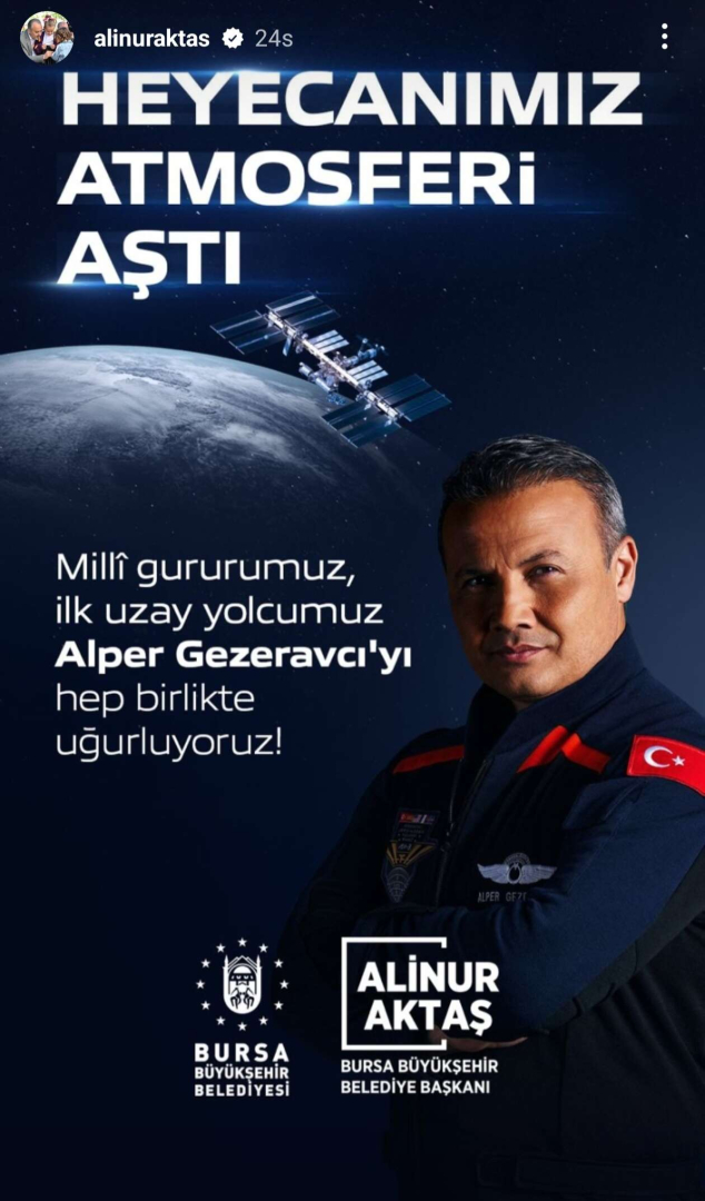 Bursa Büyükşehir Belediye Başkanı Alinur Aktaş, Türkiye'nin ilk uzaya çıkacak astronotu Hava Pilot Albay Alper Gezeravcı için heyecanını sosyal medya hesabından yaptığı paylaşımla dile getirdi. Başkan Aktaş, Alper Gezeravcı'nın Uluslararası Uzay İstasyonuna yapacağı yolculuğun ertelendiğini ancak bu durumun heyecanlarını azaltmadığını ifade etti. Yaptığı paylaşımda şu ifadeleri kullandı: