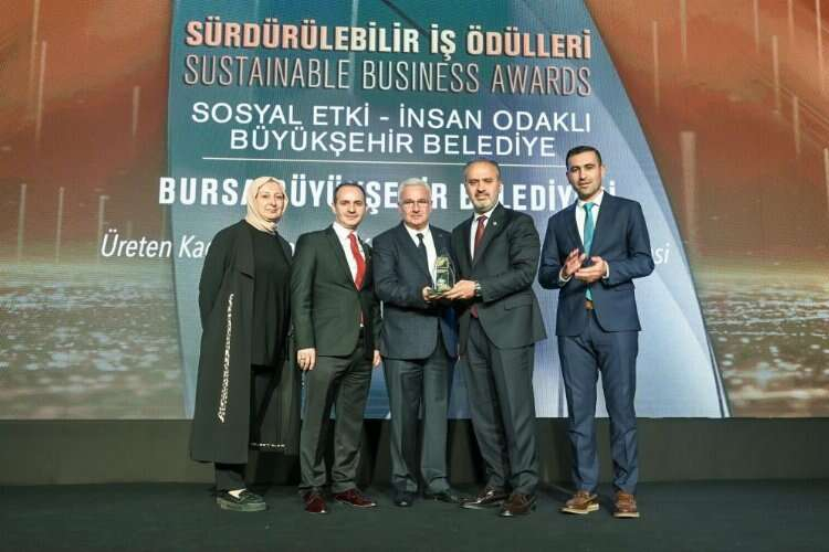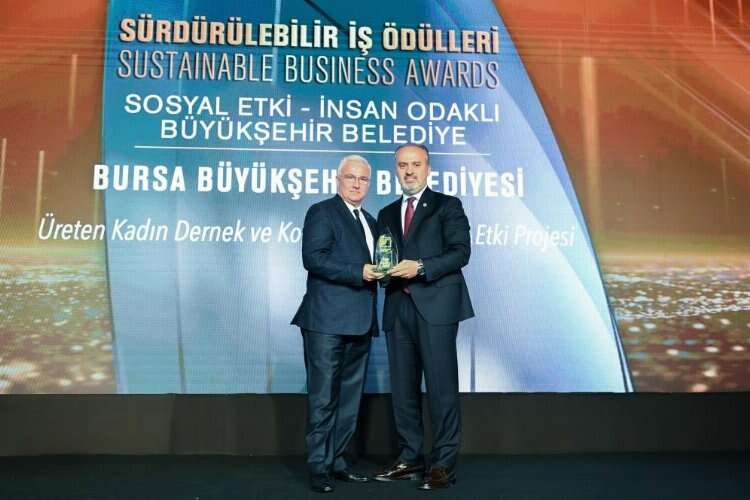 Bursa Büyükşehir Belediyesi, İnsan Odaklı Sosyal Etki Kategorisi'nde bu prestijli ödülü kazandı. Belediye Başkanı Alinur Aktaş, ödülü Sürdürülebilir İş Ödülleri jüri üyelerinden Prof. Dr. Barbaros Gönençgil'den aldı.