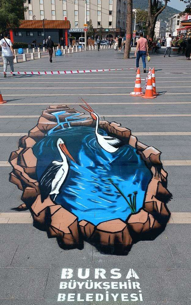 Bursa’nın yeniden yeşille anılan, estetik bir kent olması amacıyla yoğun çaba harcayan Büyükşehir Belediyesi, cadde ve sokaklardaki görüntü kirliliğinin önüne geçmek için Kent Estetiği Şube Müdürlüğü bünyesindeki sanatçılarla her geçen gün farklı uygulamalara imza atıyor. Trafo binaları, istinat duvarları ve köprülü kavşakları tuval gibi kullanıp, cadde ve sokakları sanatla buluşturan Kent Estetiği Şube Müdürlüğü’nün alanında ressamları, Bursa'yı 3 boyutlu sanatla buluşturmaya devam ediyor. Türkiye'de pek yaygın olmayan Avrupa’daki örneklerinde ise daha çok tebeşir gibi geçici boyalarla yapılan 3D uygulamalar, uzun süre etkileşimin sağlanabilmesi amacıyla Bursa'da dayanıklı özel boyalarla yapılıyor. 3D sokak boyama sanatı çalışmaları belli bir açıdan bakıldığında vatandaşlarda şaşkınlığa yol açıyor.