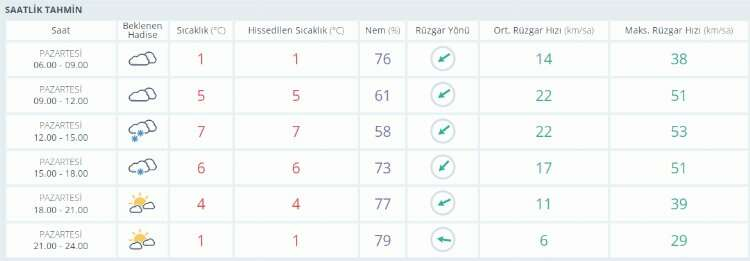 Akşam ve Gece: Akşam saatlerinde hafif kar yağışı devam ederken, termometreler 4 dereceye düşüyor. Gece saatlerinde parçalı bulutlu gökyüzü hakim olup, sıcaklık 1 derece civarında seyrediyor.
