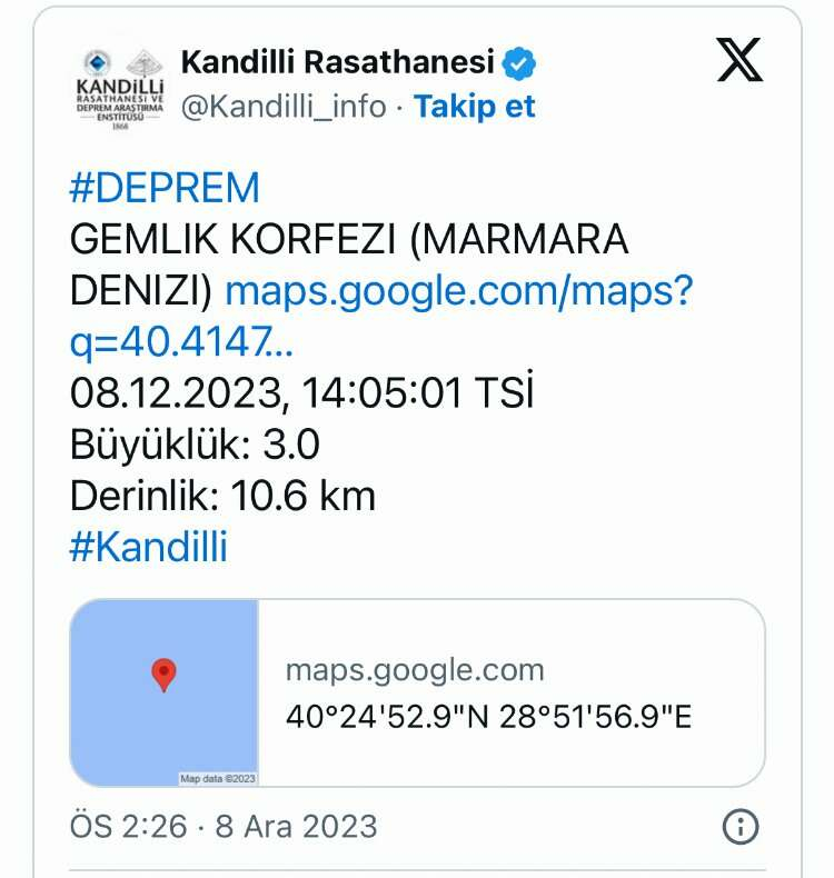 Bursa Gemlik Körfezi’nde meydana gelen 5.1 büyüklüğündeki depremin ardından, bölgedeki deprem aktivitesi devam ediyor. Kandilli Rasathanesi tarafından kaydedilen verilere göre, Marmara Denizi Bursa Gemlik Körfezi’nde 14.05’te 3.0 büyüklüğünde bir artçı deprem daha yaşandı. Bu depremin derinliği 10.6 km olarak ölçüldü.