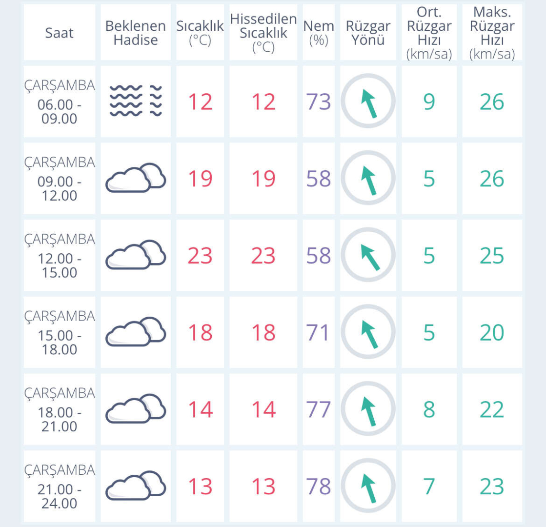 BURSA İÇİN SAATLİK HAVA DURUMU TAHMİNİ (22 KASIM 2023)