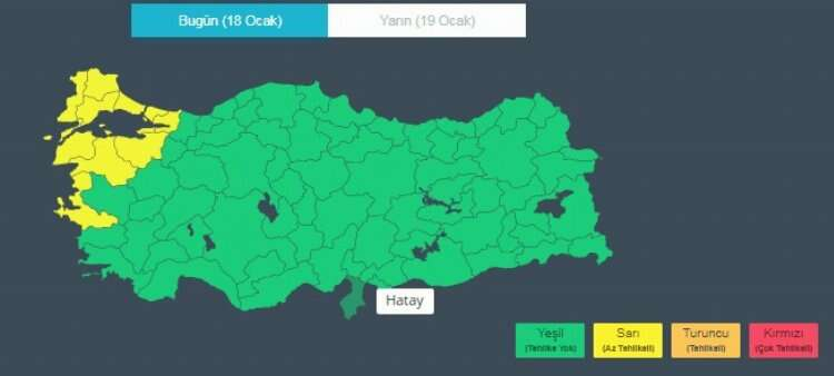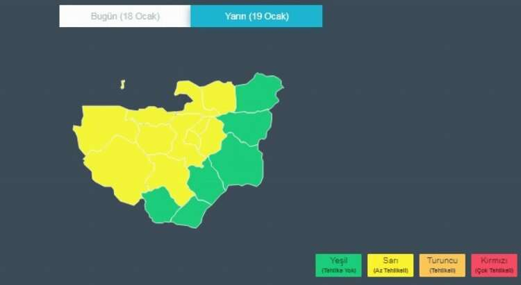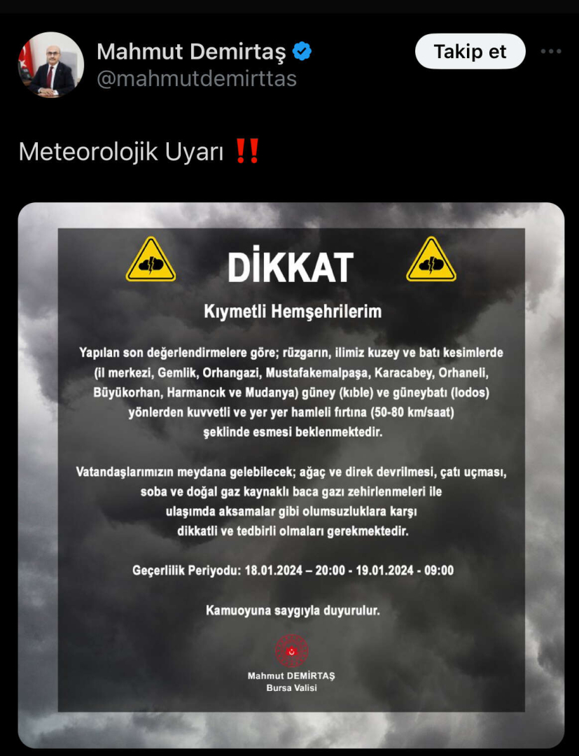 Akşam saat 20:00’den itibaren etkili olacak fırtınanın 19 Ocak Cuma günü sabah saat 09:00’a kadar süreceği belirtildi. Rüzgarın güney ve güneybatı yönlerden kuvvetli ve yer yer hamleli fırtına şeklinde esmesi bekleniyor, bu durum ağaç ve direk devrilmesi, çatı uçması, soba ve baca gazı kaynaklı zehirlenme riski gibi olumsuzluklara yol açabilir.