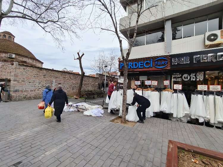 Kuvvetli rüzgarın etkisiyle ürünlerin zarar görmemesi için esnaf, hızla davranarak ürünleri yeniden toplayarak içeriye almak için uğraştı.