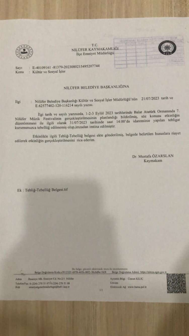 Festivalin iptal edildiğinin Nilüfer Belediye Başkanı Turgay Erdem tarafından açıklanmasının ardından Bursa Valiliği de bir açıklama yayınlayarak, "Bazı basın yayın organları ve sosyal medya hesaplarında yer alan; "Nilüfer Müzik Festivaline Yasak" başlıklı haber, yorum ve açıklamalar nedeniyle aşağıdaki hususların kamuoyu ile paylaşılması gerektiği anlaşılmıştır. Nilüfer Belediye Başkanlığı tarafından 01-03 Eylül 2023 tarihleri arasında Nilüfer-Balat Atatürk Ormanı'nda yapılması planlanan "7. Nilüfer Müzik Festivali" ile ilgili olarak emniyet personeli görevlendirilmesi, güvenlik ve trafik tedbirleri alınması talep edilmiştir. Söz konusu talep üzerine Nilüfer Kaymakamlığımızca festival düzenlenecek alanın orman alanı içerisinde bulunması nedeniyle başta orman yangınlarının önlenmesi olmak üzere; vatandaşlarımızın yaşayabileceği olumsuzluklara karşı asayiş, güvenlik, trafik ve alanda tahliye yollarının açık tutulması ve ilgili mevzuatlarda belirtilen hususlarda gerekli önlemlerin alınmak kaydıyla festivalin düzenlenmesi uygun görülmüştür.
