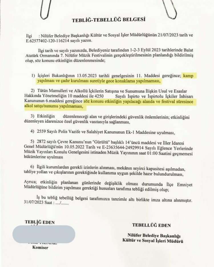 Nilüfer Belediyesi tarafından 1-2-3 Eylül'de Balat Ormanı'nda bu yıl 7.'si düzenlenmesi planllanan Nilüfer Müzik Festivali ile ilgili Valilik tarafından bazı kısıtlamalara gidilmesinin ardından Nilüfer Belediyesi festivali iptal etti.