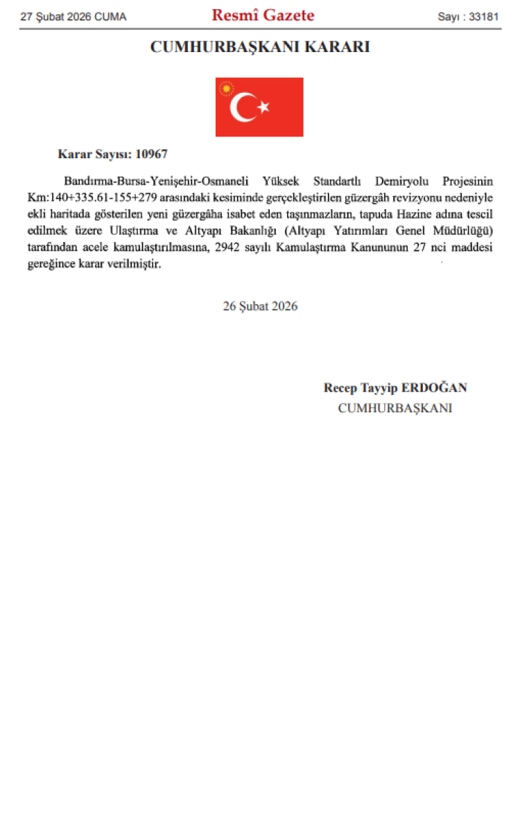 27 Şubat 2026 tarihli Resmi Gazete’de yayımlanan Cumhurbaşkanı Kararı ile Bursa Hızlı Tren Projesi kapsamında bazı taşınmazlar için acele kamulaştırma kararı alındı.