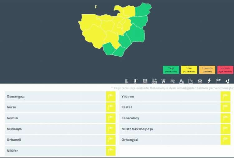Meteoroloji'nin Bursa için yaptığı sarı uyarı 11 ilçeyi ilgilendiriyor. Yapılan açıklamada kuvvetli fırtınanın Osmangazi, Yıldırım, Nilüfer, Orhangazi, Gemlik, Kestel, Gürsu, Mudanya, Orhaneli, Karacabey ve Mustafakemapaşa ilçelerini vuracağı belirtildi.