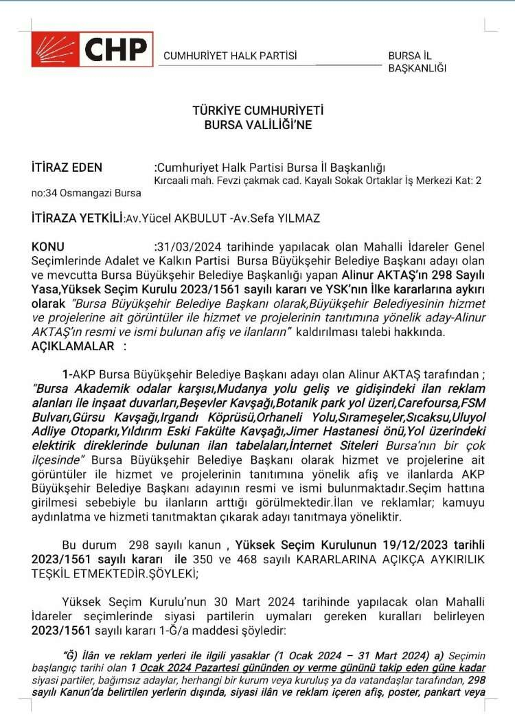 Cumhuriyet Halk Partisi (CHP) Bursa İl Başkanı Nihat Yeşiltaş, AKP'li Büyükşehir Belediye Başkanı Alinur Aktaş'ın seçim afişlerinin kentin inşaat sahalarında mevzuata aykırı bir şekilde yer almasına sert tepki gösterdi.