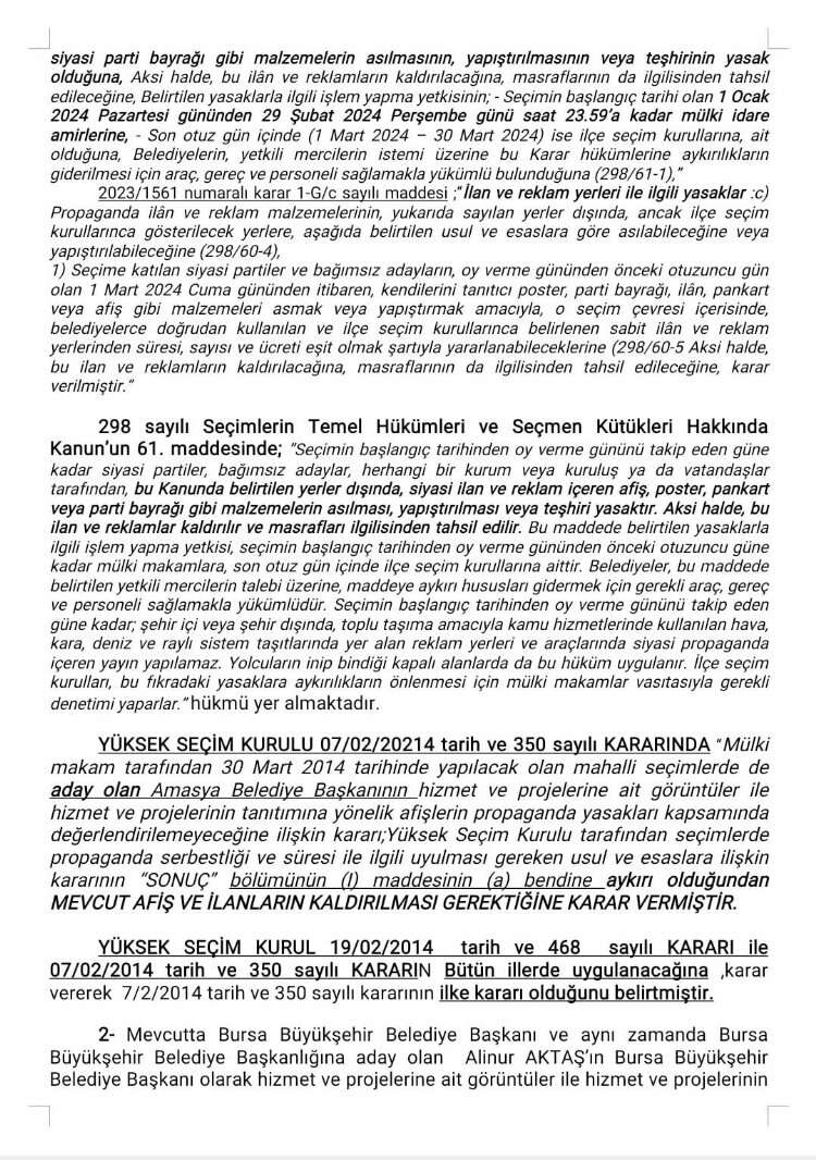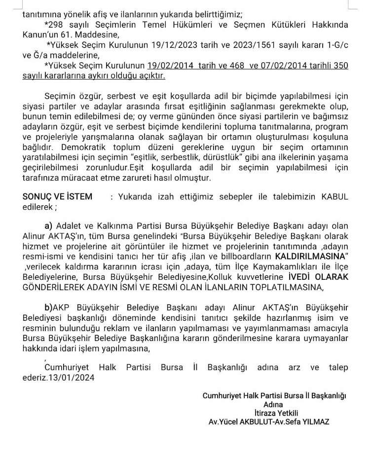 Yeşiltaş'ın açıklamalarına göre, AKP'li Büyükşehir Belediye Başkan Adayının seçim afişleri, kentin inşaat sahalarını kaplamakta ve bu durum mevzuata aykırı olarak değerlendirilmektedir. Afişlerin kentin belirli bölgelerinde asılması yasak olan yerlerde dahi görüldüğü ifade edilmektedir. CHP Bursa İl Başkanı, bu durumun önüne geçilmesi için gerekli başvuruyu Valiliğe yaptıklarını ancak Vali Mahmut Demirtaş'ın konuyu ağırdan aldığını ve henüz Yüksek Seçim Kurulu'na (YSK) aktarılmadığını belirtti.