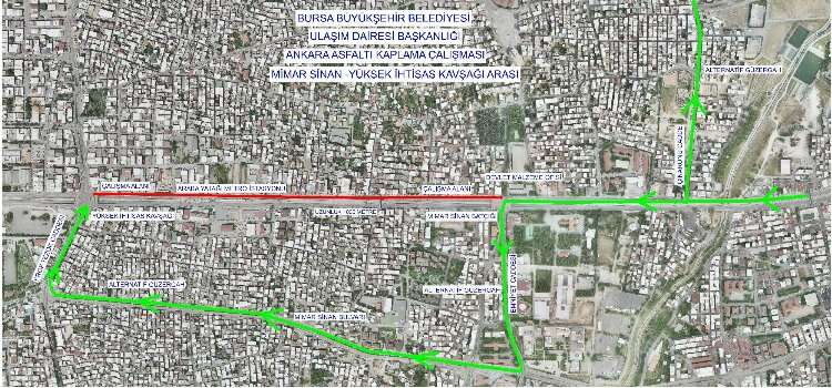 Bursa Büyükşehir Belediyesi tarafından yapılacak asfalt yenileme çalışmaları kapsamında Bursa – Ankara yolu Bursa geliş istikameti Yüksek İhtisas Kavşağı ile Mimar Sinan Kavşağı arası 11 Ağustos Cuma (BUGÜN) günü saat 23.00’dan 12 Ağustos Cumartesi (YARIN) günü saat 07.00’a ve 12 Ağustos Cumartesi (YARIN) günü saat 23.30’dan 13 Ağustos Pazar günü saat 08.00’a kadar trafiğe kapatılacaktır.