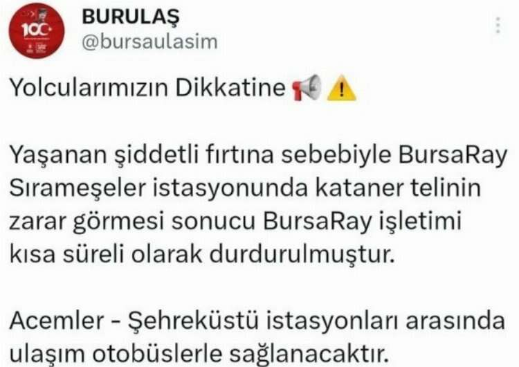Bursaray, Bursa'nın ulaşım ağındaki önemli bir parça ve günlük yaşamın ayrılmaz bir parçasıdır. Ancak, son yaşanan şiddetli fırtına, Bursaray seferlerinde bazı sorunlara yol açtı. Şiddetli rüzgar, Sırameşeler istasyonundaki kataner tellerine zarar verdi ve bu nedenle Acemler ile Şehreküstü arasındaki seferlerin durdurulmasına sebep oldu.