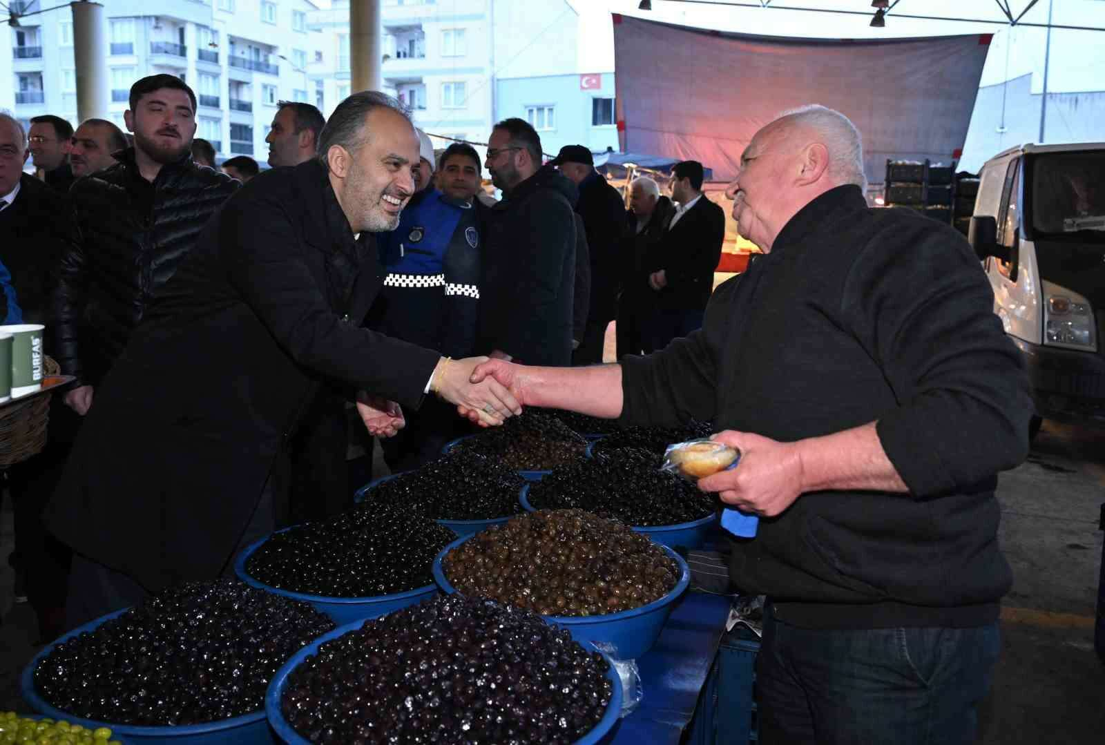 Pazarcı esnafını da tezgahlarında ziyaret eden Başkan Aktaş, Bursa gibi kutlu bir şehre hizmet etmenin verdiği sorumlulukla hareket etmeye devam edeceklerini söyledi.