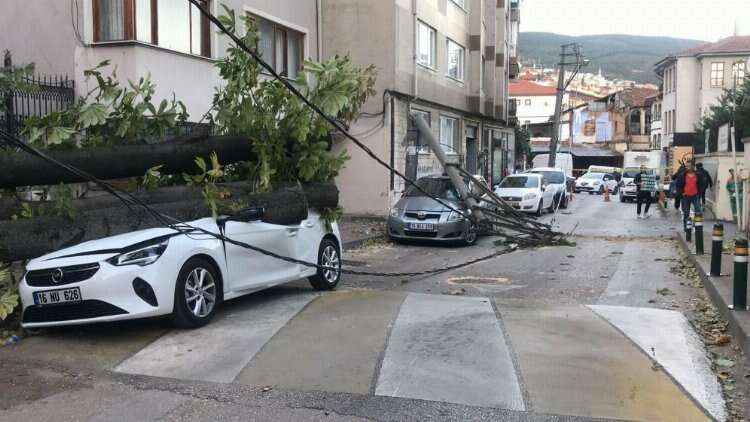 Bursa’da gün boyunca etkili olan şiddetli lodos, sabaha karşı bir ağacı ve elektrik direğini araçların üzerine devirdi. Devrilen ağaç ve elektrik direği araçlarda maddi hasar meydana getirdi.