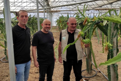 Balabancık Mahallesi Muhtar Ali Ceylan ve Mudanya İlçe Tarım ve Orman Müdürü Ergün Karadağ'ı tesislerinde ağırlayan üretici Yusuf Uçan, Mudanya'nın Balabancık Mahallesinde 1,5 dönüm arazi üzerine kurduğu sera tesislerinde ektiği ejder meyveleri 3 sene sonunda meyve vermeye hazırlanıyor.