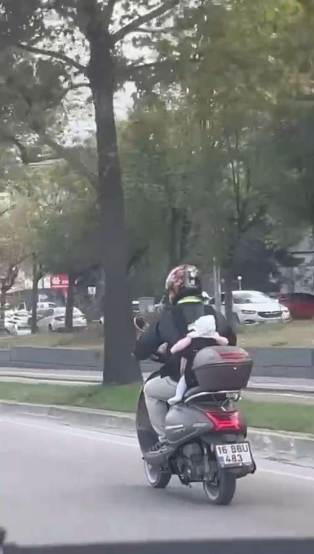 Bursa'da tehlikeli motosiklet yolculuğu: Baba, bebeğini arkasına bağlayarak ilerledi.