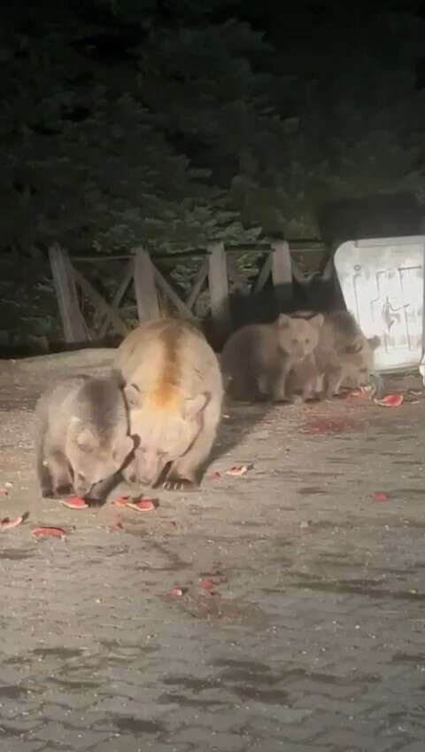 Uludağ sık çam ormanları arasında yüzlerce yabani hayvana ev sahipliği yaparken, Sarıalan bölgesinde karnı acıkan ayı ailesi çöp konteynerlerini karıştırıp yiyecek aradı O anlar orada bulunan vatandaş tarafında kayıt altına alındı. Çöp konteynerında buldukları yiyecekler ile karınlarını doyuran ayı ailesi oradan uzaklaştı