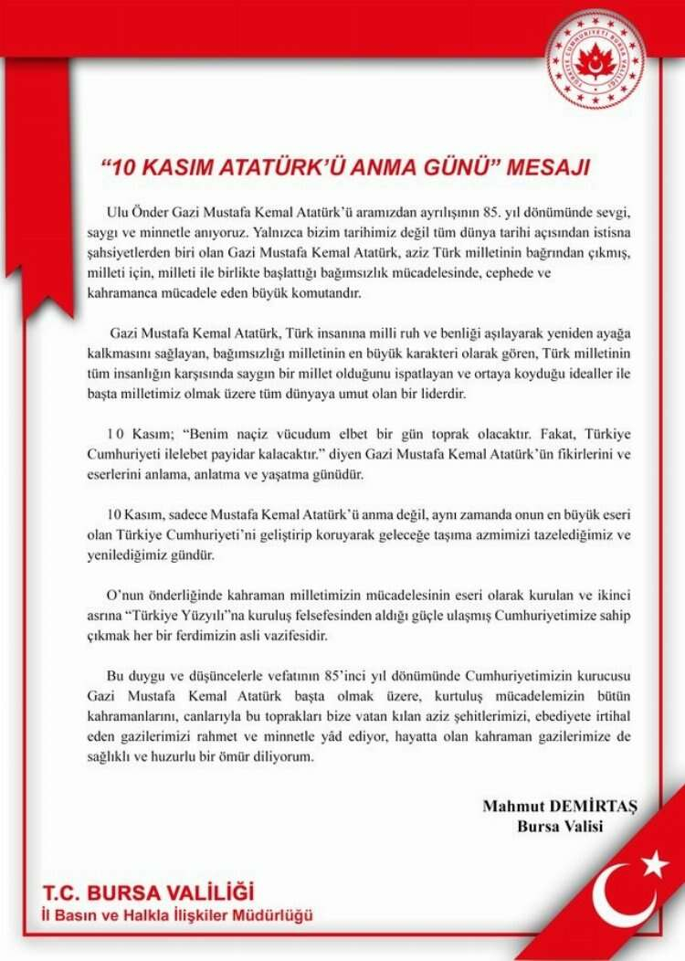 Bursa Valisi Mahmut Demirtaş, Gazi Mustafa Kemal Atatürk'ü ebediyete intikalinin 85. yıldönümünü rahmet ve minnetle andıklarını söyledi.